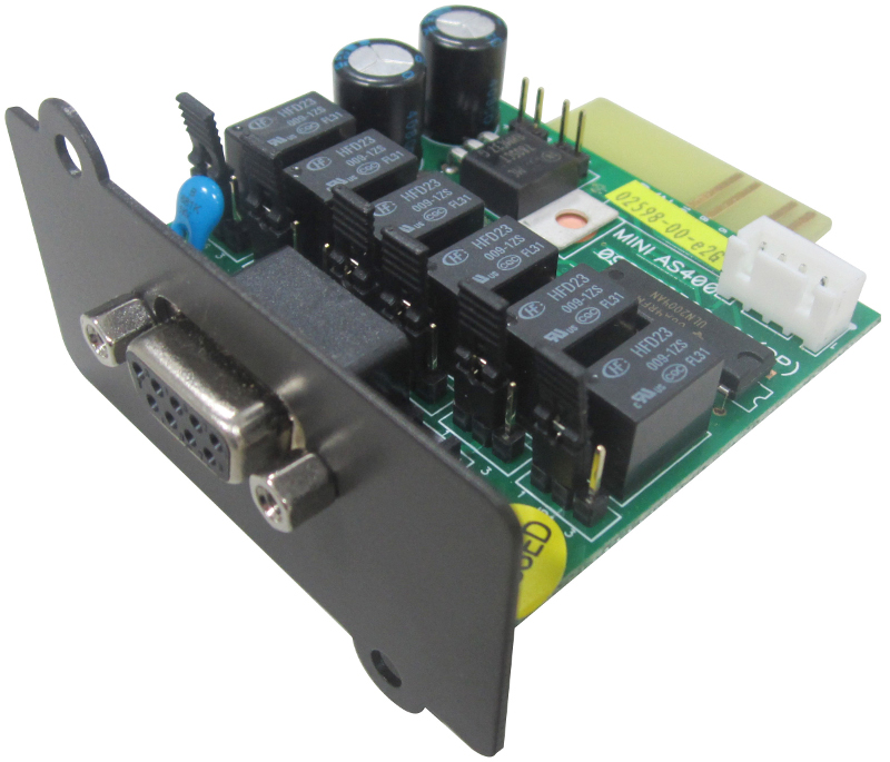 AS/400 Cards provide clean dry contacts for remote shutdown and monitoring of a UPS. It is frequently used along with PLCs and signal control panels. Information delivered are UPS failure, Alarm, Main Fail, Bypass, Battery Low, UPS On. Using AS/400 it possible to shutdown UPS remotely. Solution requires external 12V/24VDC source for a high signal. Pin assignment is available in User's Manual. AS/400 Card for: VFI MP 3/3